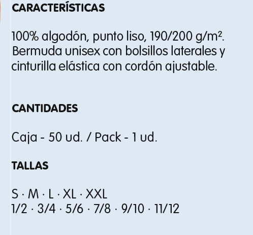 Bermuda unisex con bolsillos laterales y cinturilla elástica con cordónl ajustable.